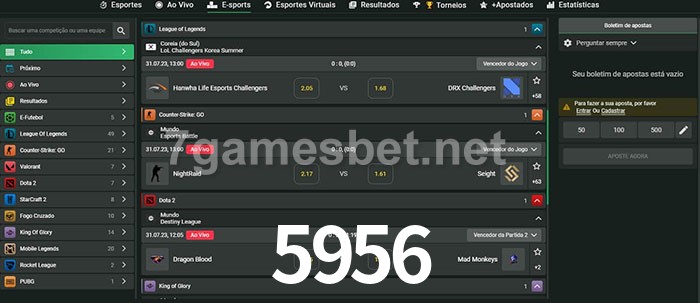 O 5956 oferece uma grande seleção de opções de apostas em e-sports com probabilidades competitivas